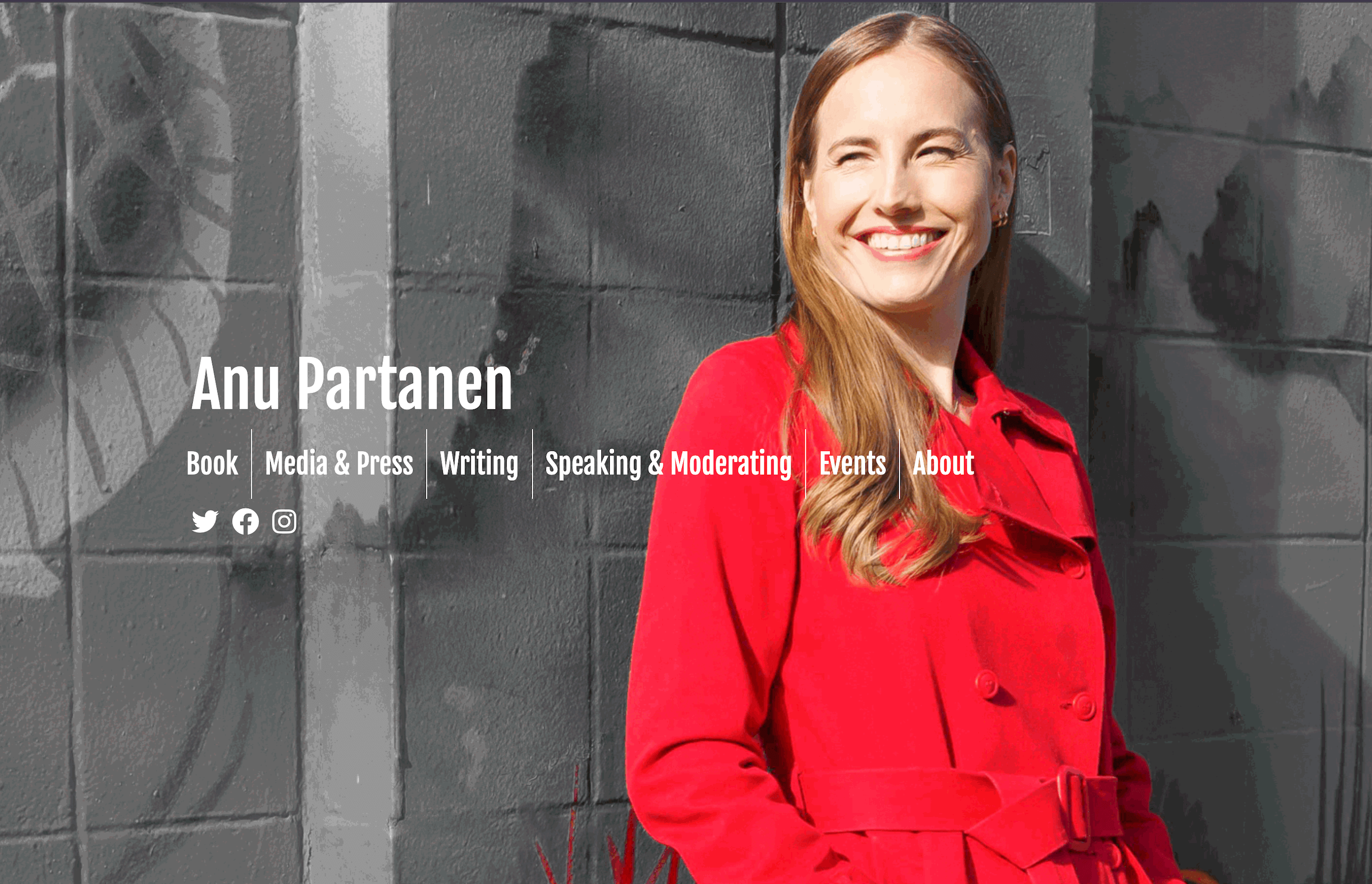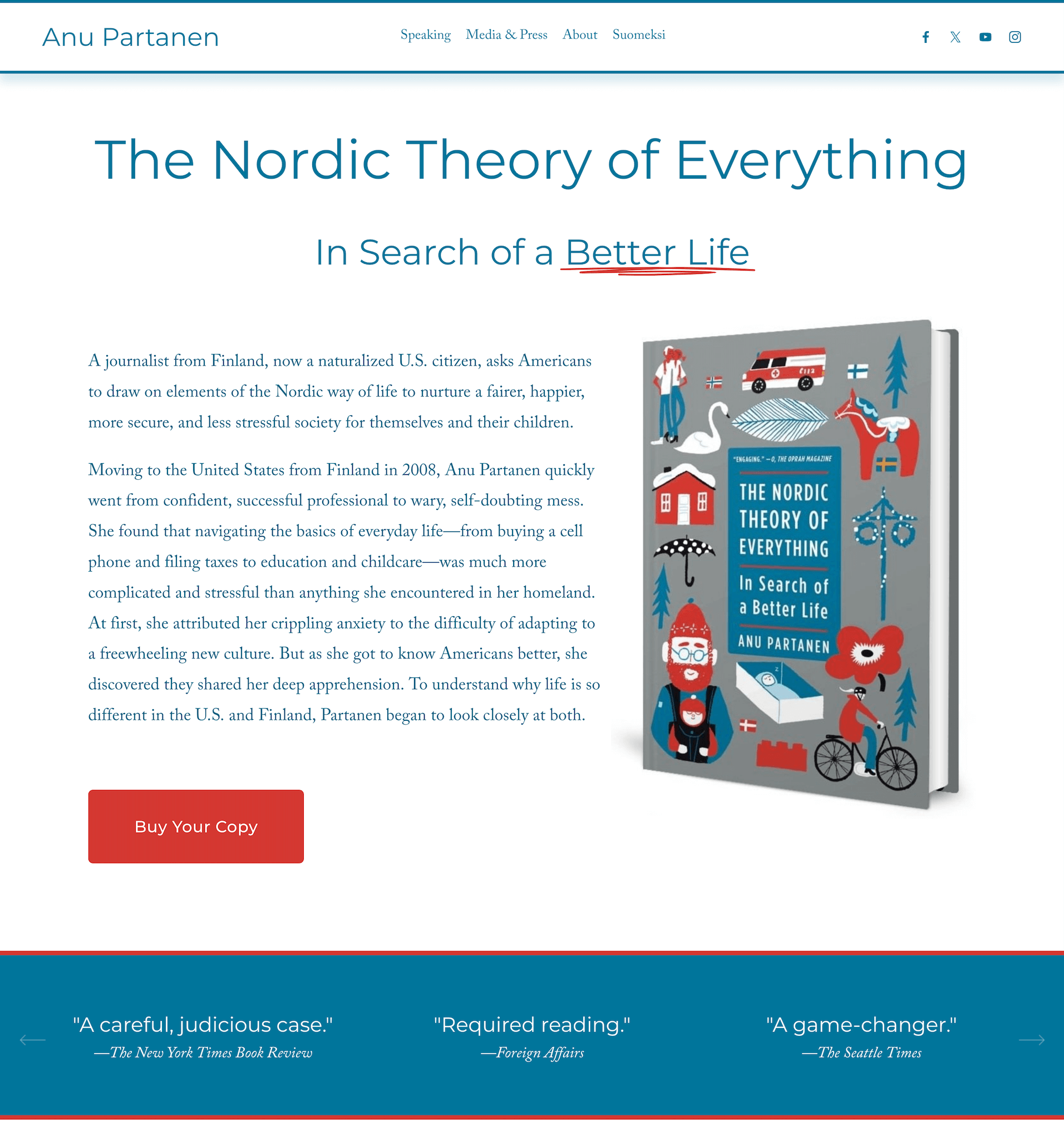 Our second example is non-fiction author Anu Partanen. After I read her book, The Nordic Theory of Everything, I visited her site and found that her homepage was a landing page.